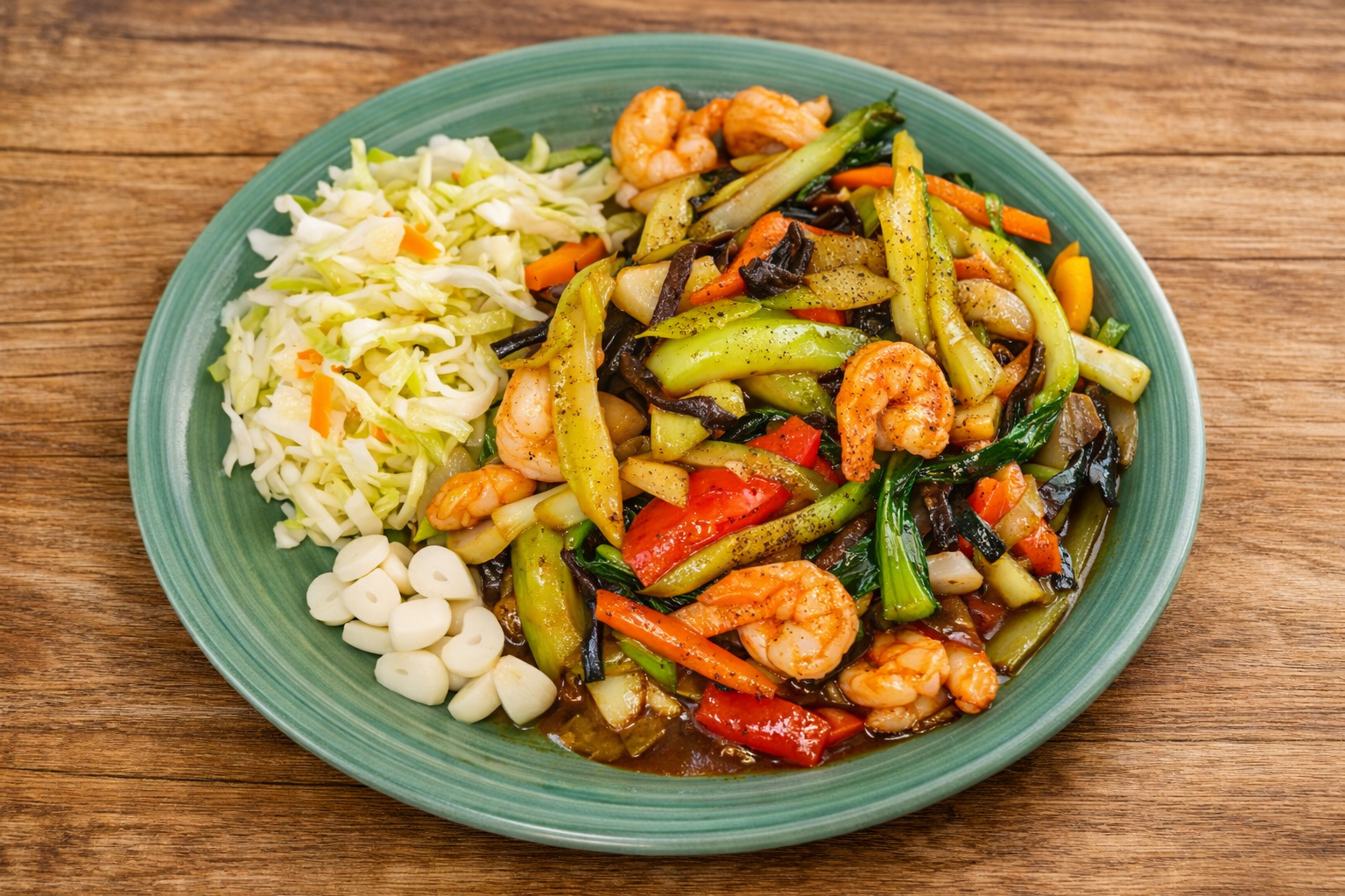 – makaron sojowy z krewetkami i warzywami na bazie sosu sojowego i rybnego z surówką.