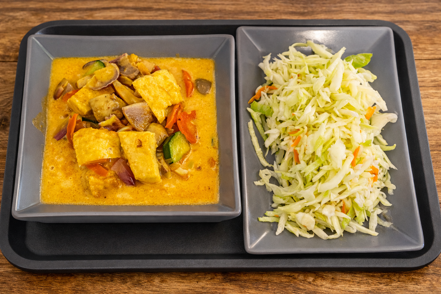 – kurczak oraz tofu po tajsku, z warzywami i mlekiem kokosowym, ryżem, surówką,