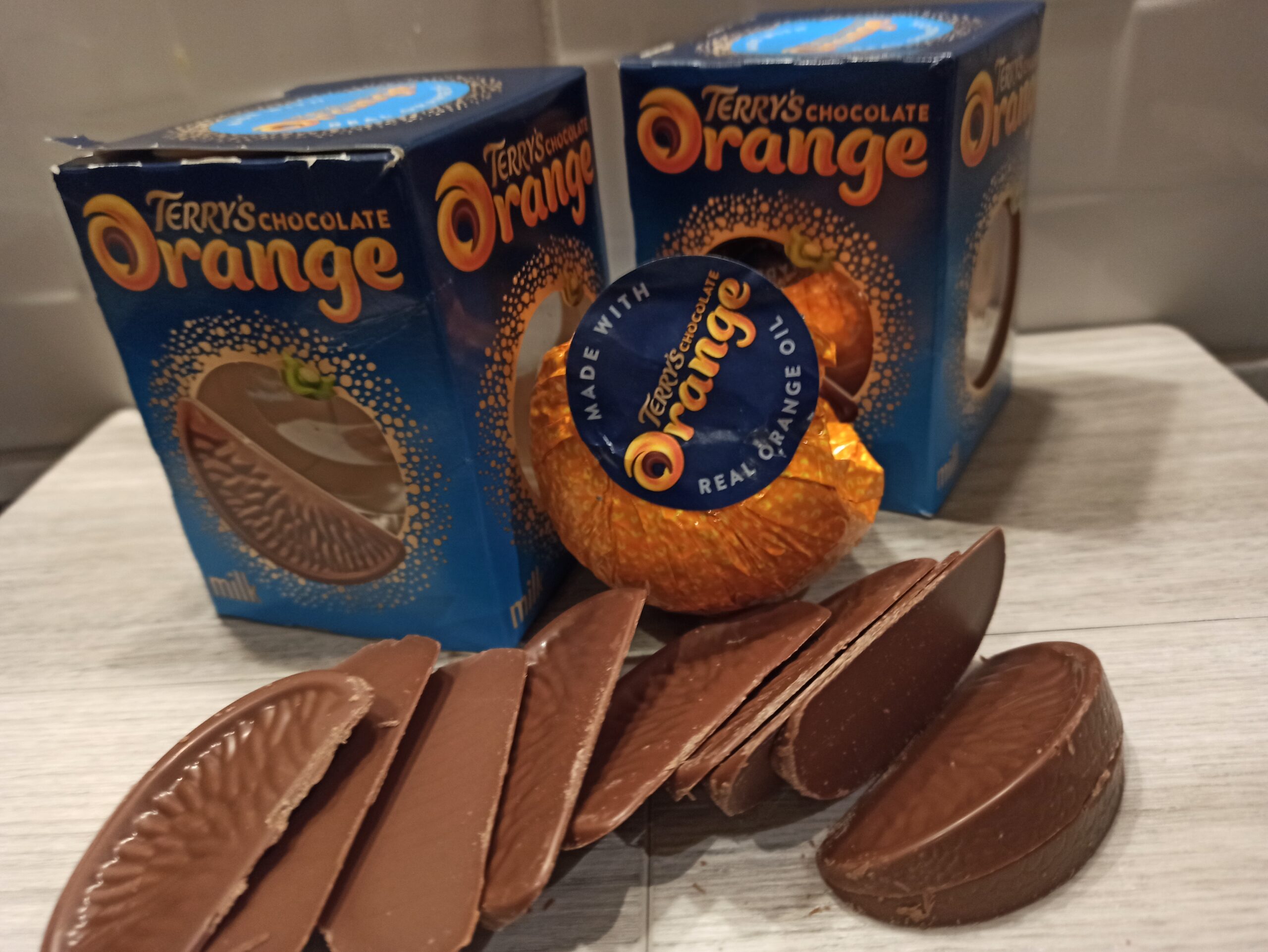 – Kula Terry’s Chocolate Orange rozdzielającej się na 20 segmentów, niczym cząstki pomarańczy. Jest to aksamitna czekolada połączona z naturalnymi olejkami pomarańczowymi, jedzona przeważnie na święta Bożego Narodzenia.
