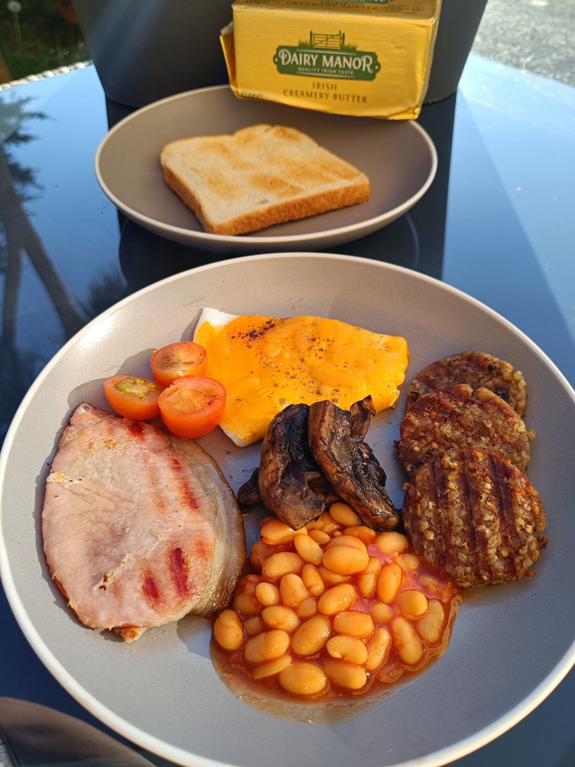 English Breakfast to danie składające się ze smażonych kiełbasek wieprzowych (sausages), smażonych plastrów bekonów (rashers), jajek sadzonych, white pudding (rodzaj białej kaszanki) lub black pudding (rodzaj czarnej kaszanki), pieczony pomidor (oven-baked tomato), smażone pieczarki, tosty, frytki lub pieczone ziemniaki, fasolka w sosie pomidorowym.